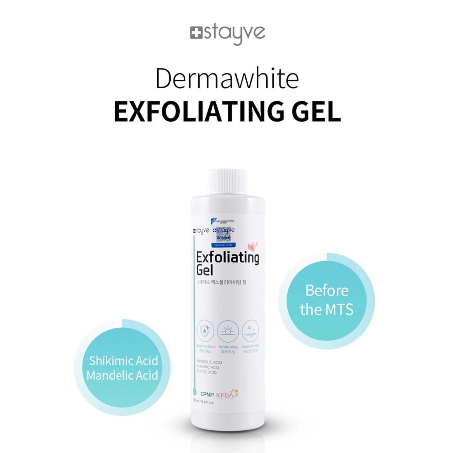 Stayve Dermawhite Exfoliating Gel contains Mandelic Acid and it helps to remove dead skin cells without irritation. It is also effective for adult acne because it promotes antibacterial functions and cell growth. It is specifically designed for Microneedling Therapy System.